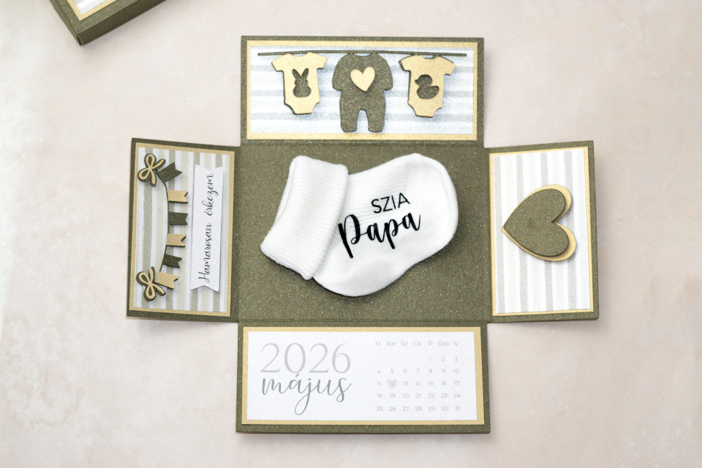 A dobozba helyezett zokni hordozza az örömhírt, így kreatívan és szeretettel tudod bejelenteni családnak és barátoknak a kis jövevény érkezését.