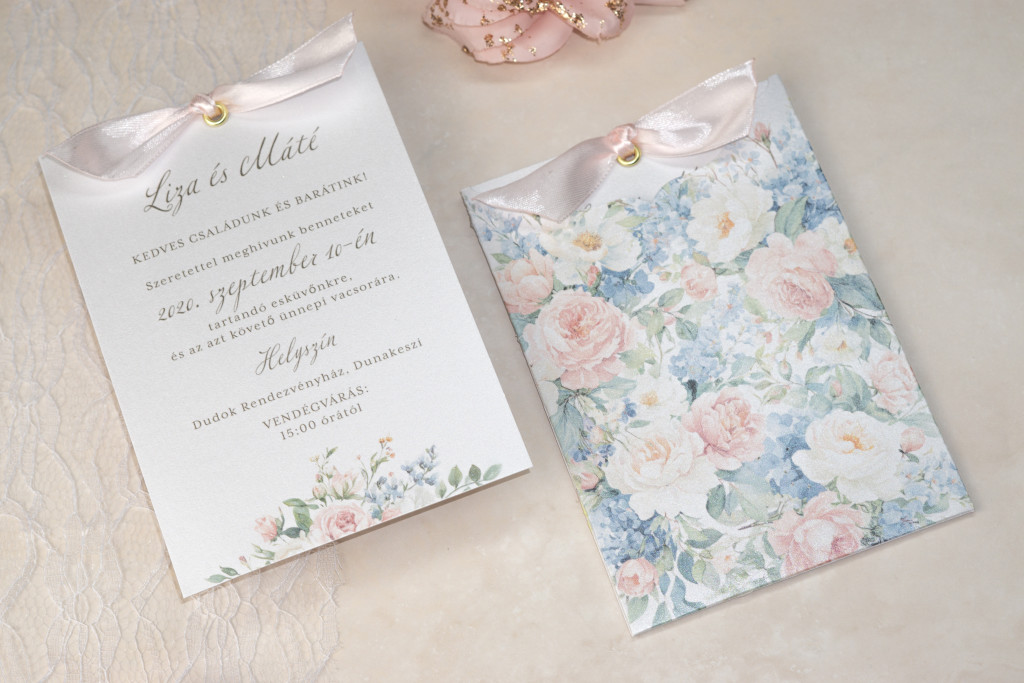 Interaktív kialakítás: A meghívó egy gyönyörű, virágmintás tokban érkezik, amelyből a belső lapot egy finom masni segítségével lehet kihúzni. Ez a kis rituálé még emlékezetesebbé teszi a pillanatot.