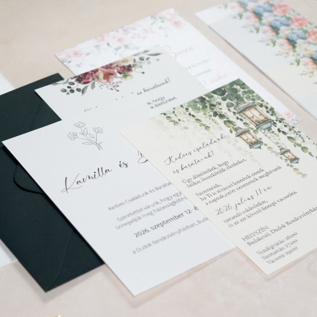 - 4 db Meghívó (A6 méret): A legnépszerűbb stílusaink (Minimál, Romantikus/Virágos, Klasszikus és Modern) különböző papírtípusokra nyomtatva.