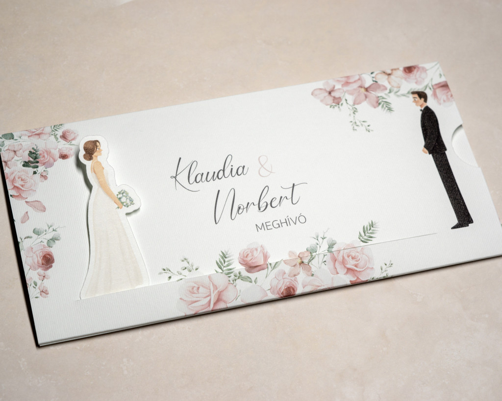 A Tökéletes Rózsaszín: A tok (vagy a betétlap) lágy pasztell rózsaszín árnyalata a szeretetet, a gondoskodást és a boldogságot sugározza. Nem harsány pink, hanem elegáns „blush” (púder) tónus, ami minden esküvői stílushoz illik.