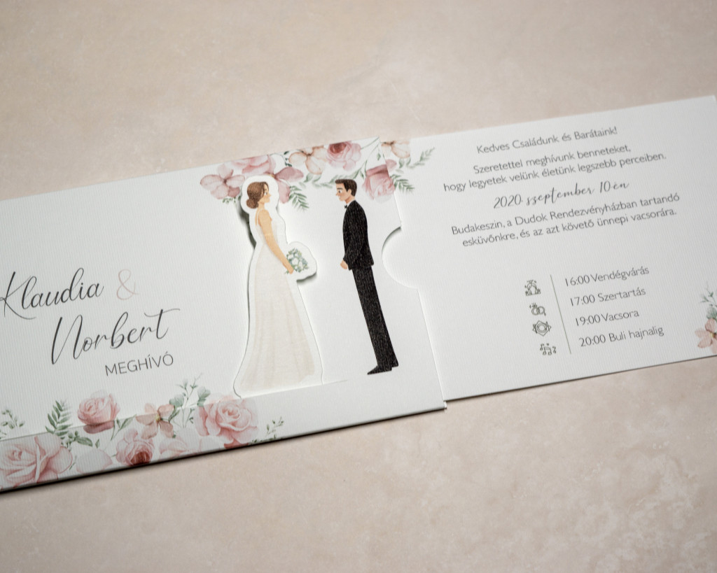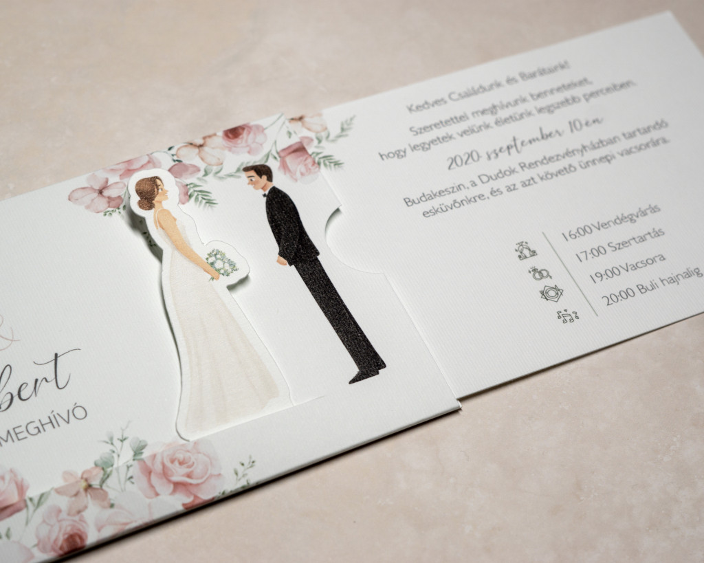 Interaktív Kialakítás: A meghívó nem kinyitható, hanem kihúzható. Ez a kis aktivitás azonnal bevonja a vendéget, és élménnyé teszi az információk elolvasását.