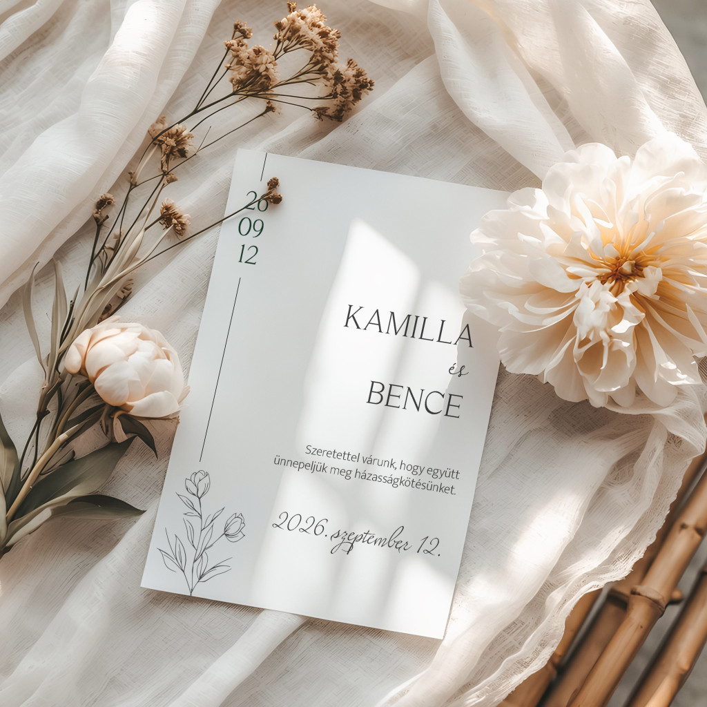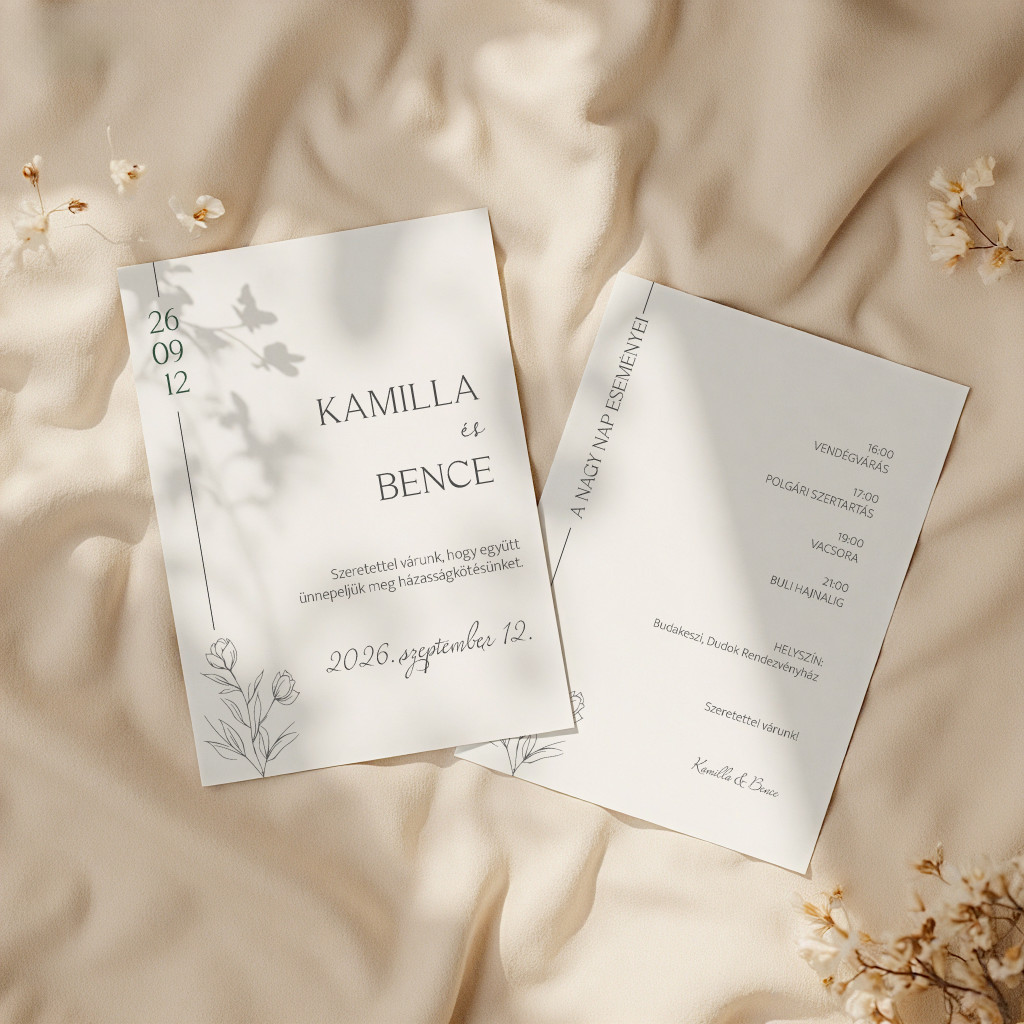 Kétlapos Kialakítás (Opcionális): A legnagyobb előnye a flexibilitás. Kérhetitek egyetlen lapként, de igazán kétlapos verzióban érvényesül. Így a fő meghívó tiszta maradhat, míg a részleteket (program, szállás) a kísérőkártya hordozza.