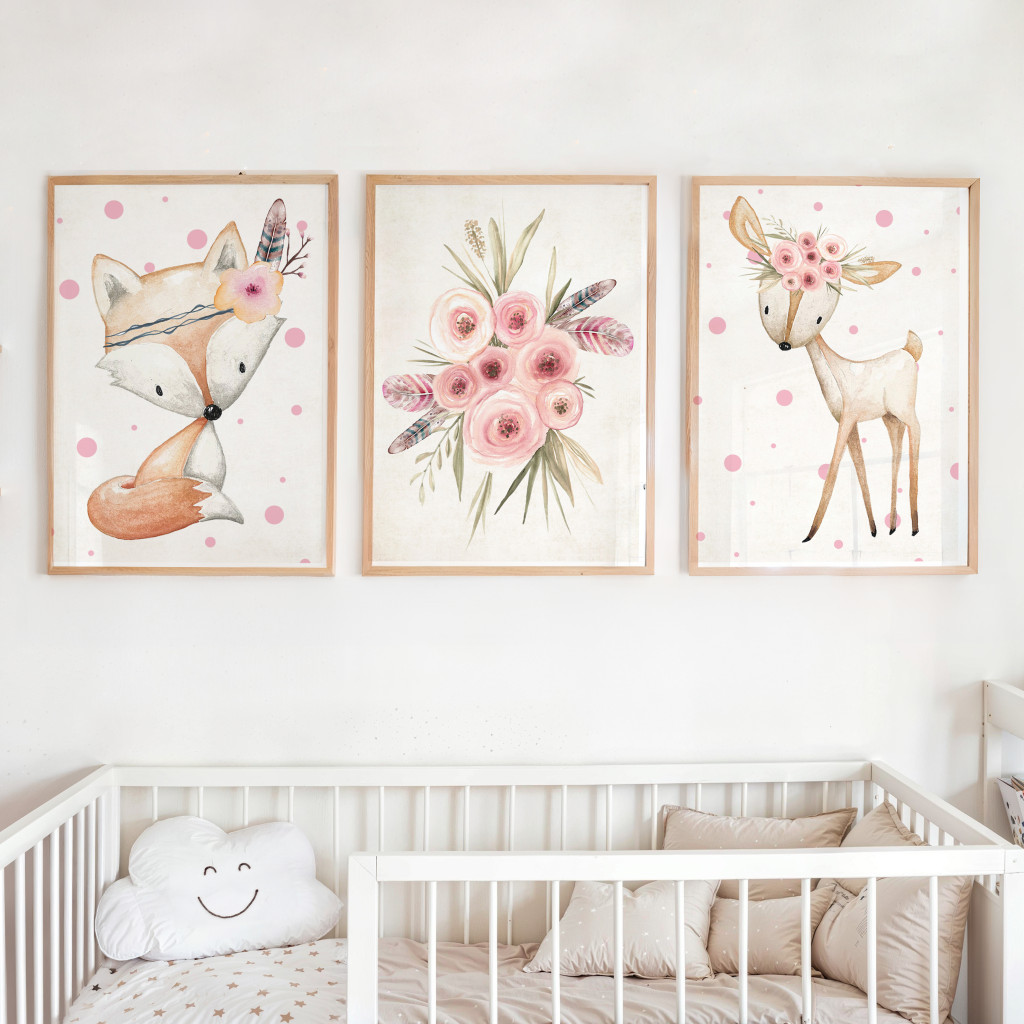 Ez a baba poszter szett három harmonikusan összeválogatott képből áll: egy kedves róka, egy barátságos őzike és egy finom virágcsokor alkotja az összeállítást. A lágy, rózsaszínes színvilág és a bohókás illusztrációk nyugodt, szeretetteljes hangulatot teremtenek, így tökéletes választás kislány babaszobába vagy gyerekszobába.