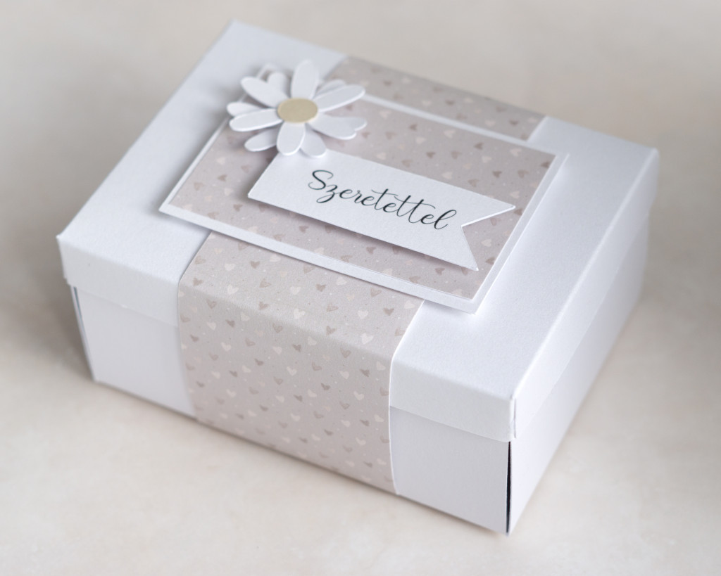 Doboz: Kb. 11 x 8,5 x 5 cm méretű, prémium minőségű, 300 g-os csillogó kreatív kartonból, szívecskés dekorációval.