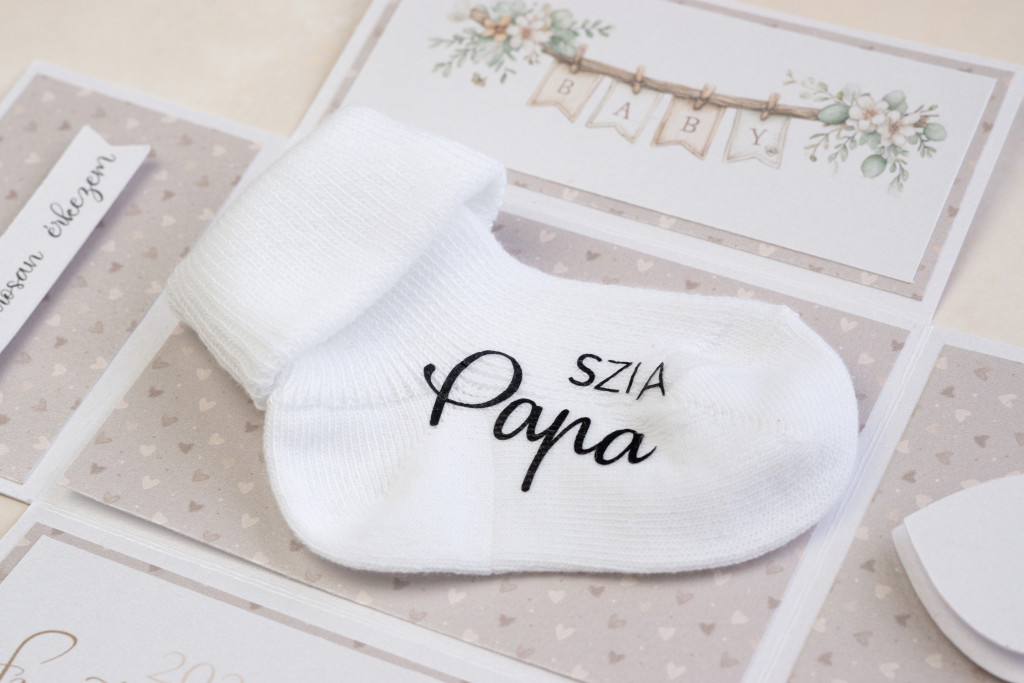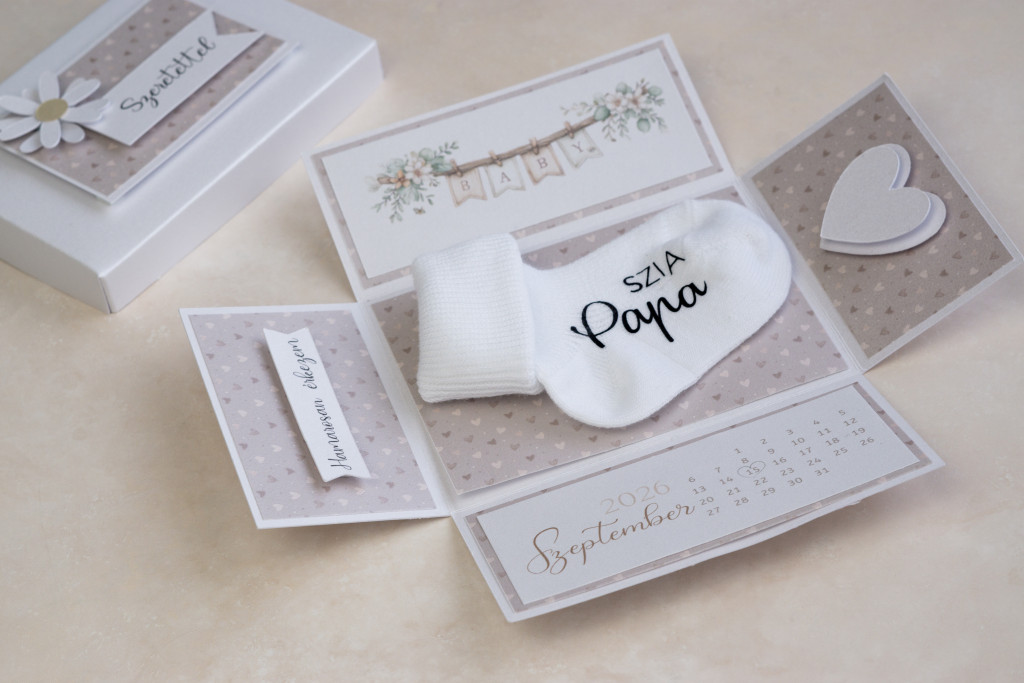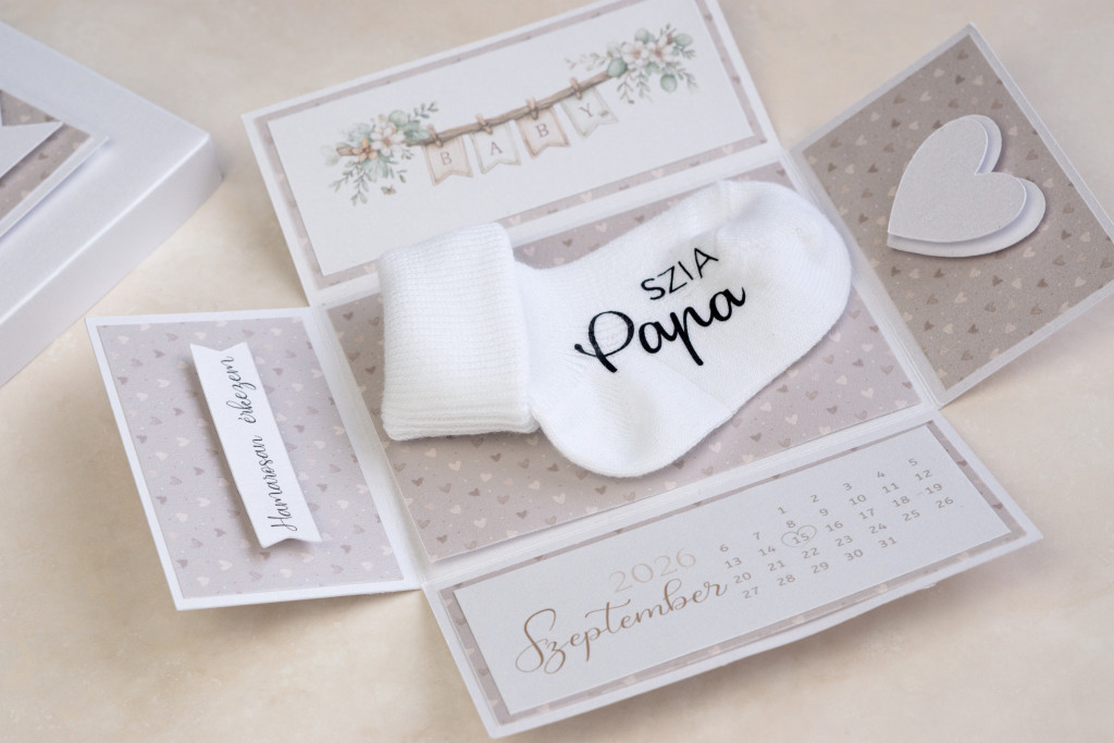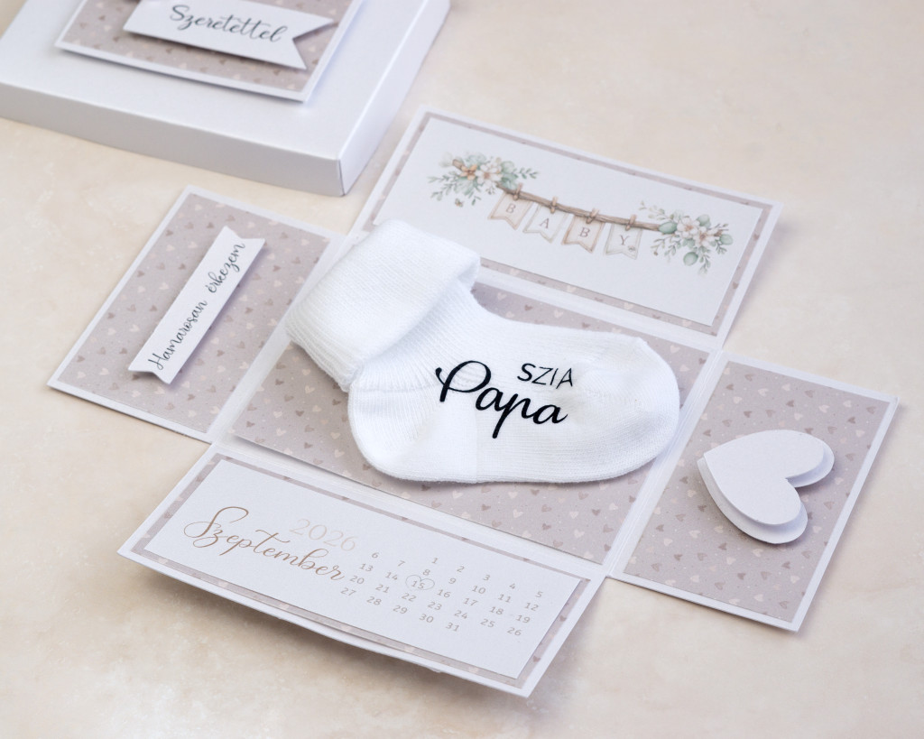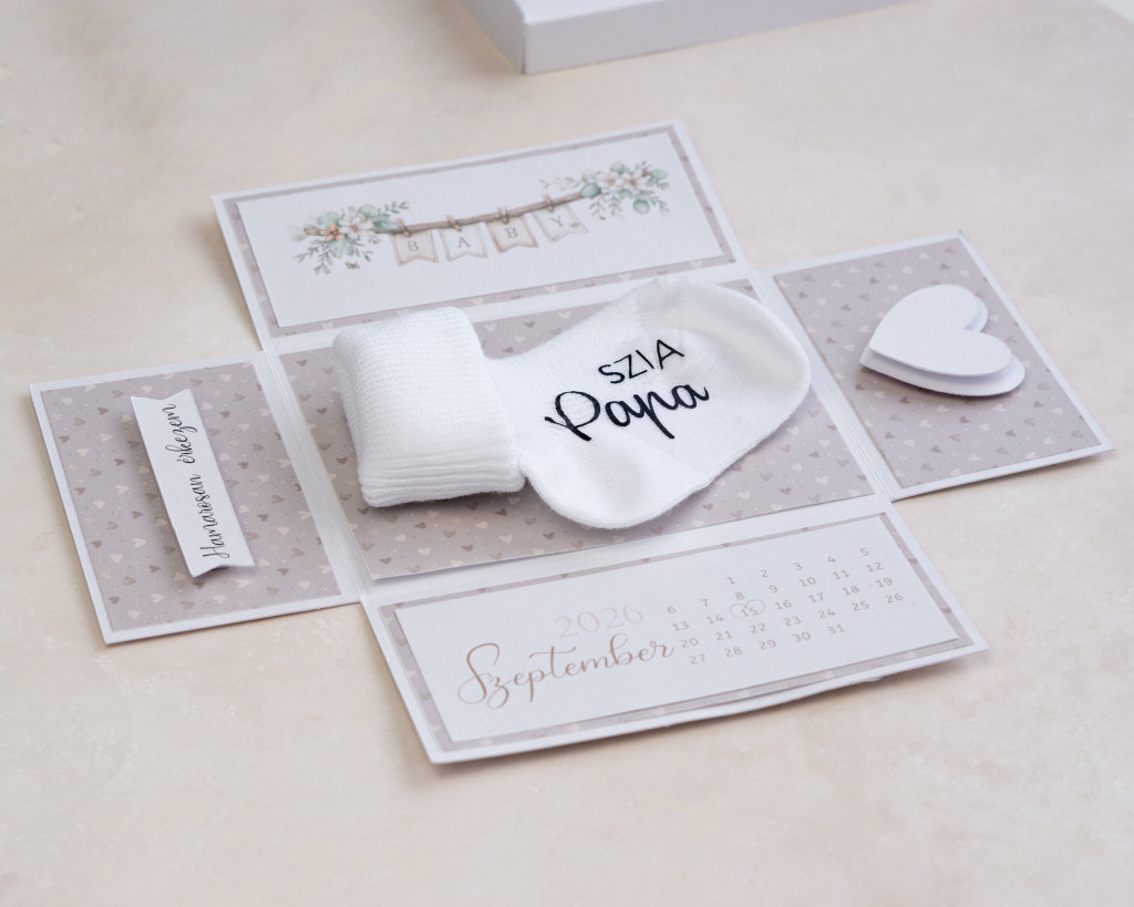 Ez a különleges doboz kívülről egy elegáns, szívecskés ajándéknak tűnik, de a belseje igazi varázslatot rejt. A doboz tetejét leemelve az oldalak „kinyílnak”, feltárva a nagy hírt: a pici érkezésének dátumát és egy pihe-puha babazoknit, rajta az általad kért személyes üzenettel.